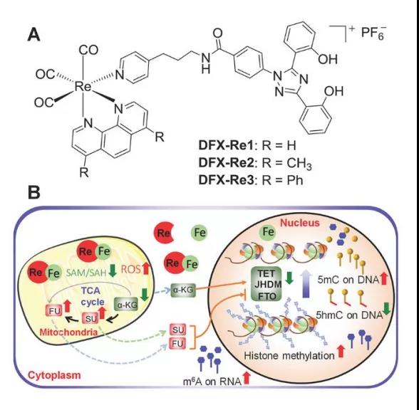 文章設(shè)計了三個線粒體靶向錸(I)配合物,其中加入了一種臨床鐵螯合劑脫鐵石(DFX),以同時干擾線粒體代謝和鐵穩(wěn)態(tài)。其中,DFX-Re3可以將細胞鐵遷移到線粒體,干擾線粒體代謝,包括與表觀遺傳修飾相關(guān)的關(guān)鍵代謝物。