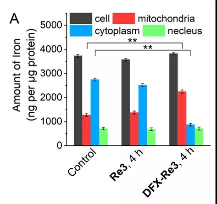 (1)ICP-MS實驗:DFX-Re3將細胞中鐵轉(zhuǎn)移到線粒體