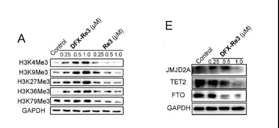 通過免疫印跡實驗發(fā)現(xiàn)DFX-Re3處理后抑制甲基化組蛋白H3、JMJD2A、TET2、FTO等甲基化修飾酶的表達。細胞質(zhì)中鐵含量的降低,同時這些結(jié)果表明,鐵在細胞內(nèi)轉(zhuǎn)移到線粒體可以增加DNA、RNA和組蛋白甲基化水平。