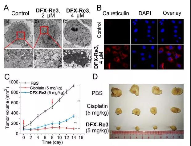 在體內(nèi)和體外評估了DFX-Re3的抗癌機制。透射電鏡觀察顯示,DFX-Re3 (2 M, 24 h)處理后線粒體明顯膨脹,提示MMP缺失。濃度較高時,細胞核邊緣和中心出現(xiàn)染色質(zhì)凝聚,細胞核碎裂,提示晚期凋亡。Annexin V/碘化丙啶(PI)雙染色顯示,在DFX-Re3處理的樣品中,凋亡早期和晚期細胞比例呈劑量依賴性增加(圖S36)。DFX-Re3激活caspase 3/7, Z-VAD-FMK(泛caspase抑制劑)預(yù)處理可抑制細胞死亡率。與之前的RNA-seq結(jié)果一致,DFX-Re3可以誘導(dǎo)多種免疫相關(guān)基因的表達改變,DFX-Re3誘導(dǎo)免疫相關(guān)基因表達改變。誘導(dǎo)鈣網(wǎng)蛋白調(diào)控,這是免疫原性死亡的重要分子標記。這些結(jié)果表明,DFX- Re3可誘導(dǎo)caspase依賴的免疫原性凋亡。體內(nèi)抗腫瘤實驗中,DFX-Re3未見小鼠死亡或體重明顯減輕,治療結(jié)束時,DFX-Re3未見臟器明顯病理改變。這些數(shù)據(jù)表明,DFX-Re3在體內(nèi)具有高的抗癌作用和低的全身毒性。
