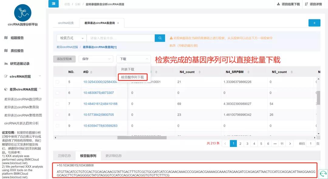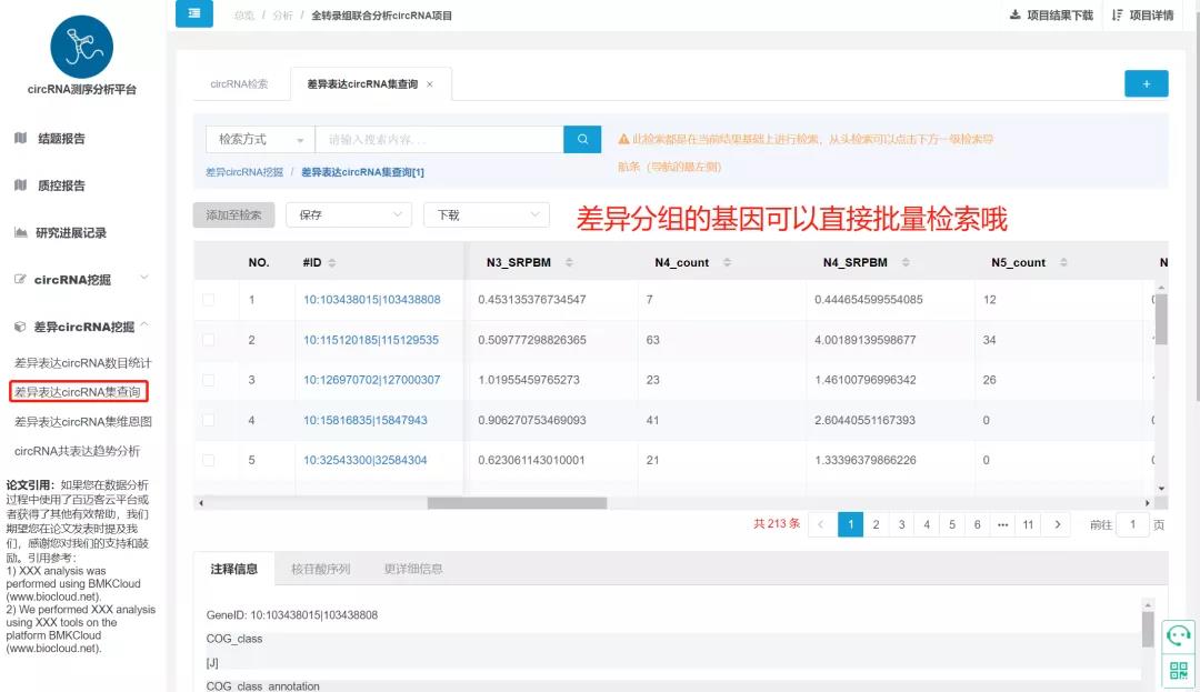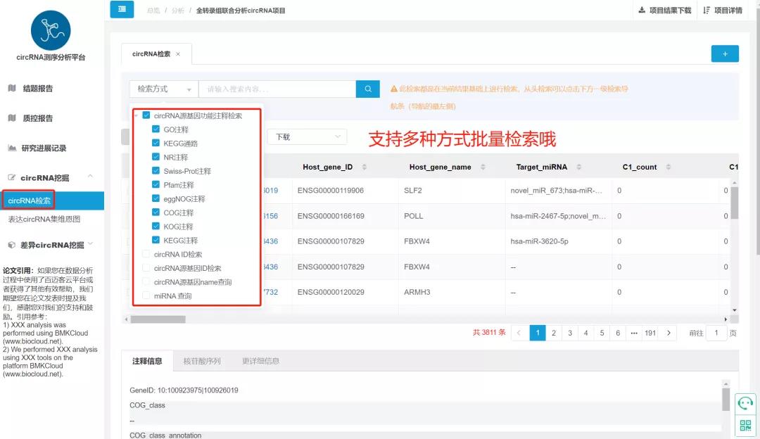 CircRNA的功能分析主要依靠于來源基因的功能注釋,如何在海量的數(shù)據(jù)中直接找到關(guān)心的目的基因呢?首先就是根據(jù)功能注釋進(jìn)行檢索,百邁客云平臺的CircRNA分析平臺中,支持針對結(jié)果根據(jù)八大功能數(shù)據(jù)庫的注釋信息批量檢索相關(guān)注釋基因、并且批量提取相關(guān)信息;靶向關(guān)系的預(yù)測也是關(guān)鍵circRNA檢索的必要一步,CircRNA分析平臺同時支持通過miRNA的ID批量提取相關(guān)靶向的CircRNA信息,此外,CircRNA ID、來源基因ID、來源基因name等功能,通過上傳ID文件均可實現(xiàn)批量查詢,甚至可以批量下載序列文件,省去多個文件來回切換的繁雜操作,一鍵式提取關(guān)鍵信息!
