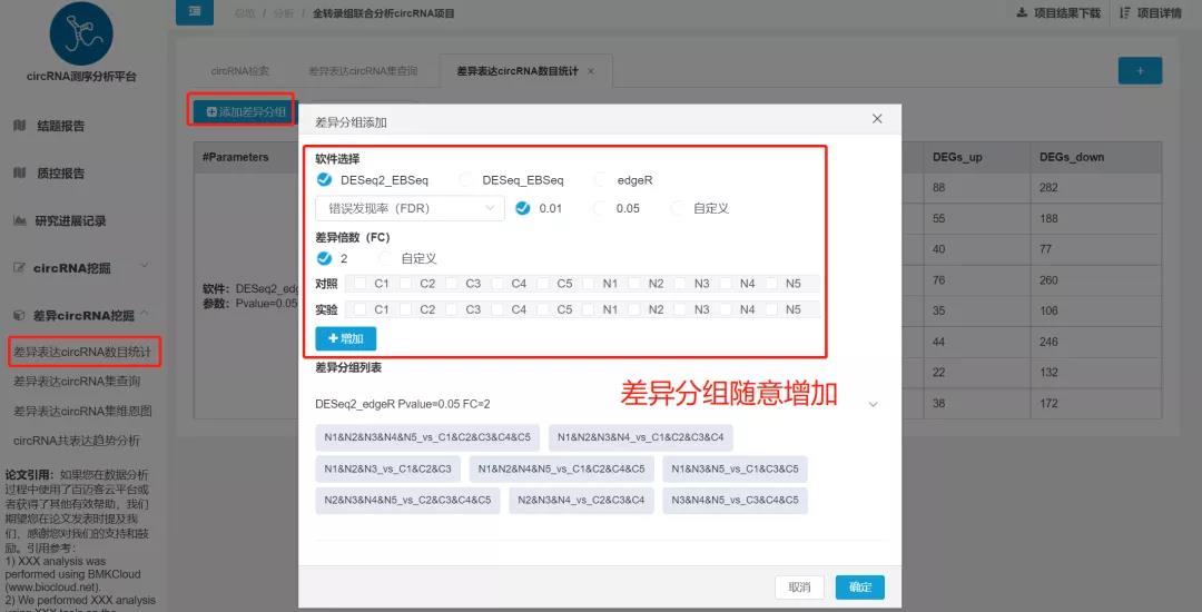 對于需要通過結(jié)果分析挑選關(guān)鍵基因的研究方向來說,選擇合適的差異篩選條件對于基因的選擇是事半功倍的,但是往往合適的篩選條件需要多次的調(diào)整摸索,這時差異篩選條件的調(diào)整功能顯得尤為重要,CircRNA云平臺同樣支持在線完成差異參數(shù)的調(diào)整,基因數(shù)目太少、差異軟件不合適、參數(shù)設(shè)置不合理等問題,通通可以調(diào)整!不限次、不限時,只需簡單的點擊,輕松完成!