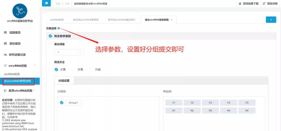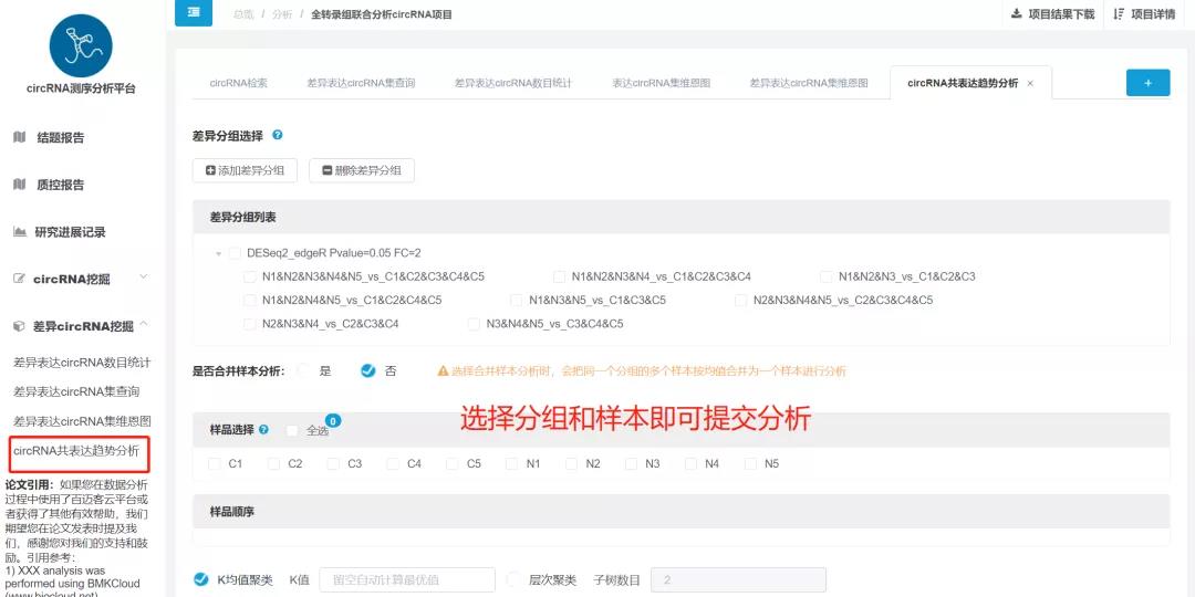 共表達(dá)分析常用于識別差異表達(dá)基因的共表達(dá)模式,分析各樣品間CircRNA表達(dá)豐度的不同變化模式,將相同表達(dá)趨勢的CircRNA劃分為一個數(shù)據(jù)集,通常我們認(rèn)為,具有相同表達(dá)變化趨勢的基因的功能互有關(guān)聯(lián),所以通過分析CircRNA的共表達(dá)趨勢分析,可以進(jìn)一步篩選出項目中關(guān)鍵的基因集合。CircRNA分析平臺搭載了共表達(dá)分析個性化,簡單的選擇基因集合以及樣本即可完成分析。