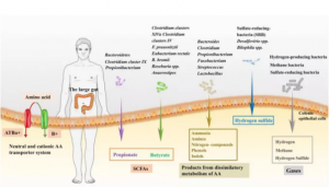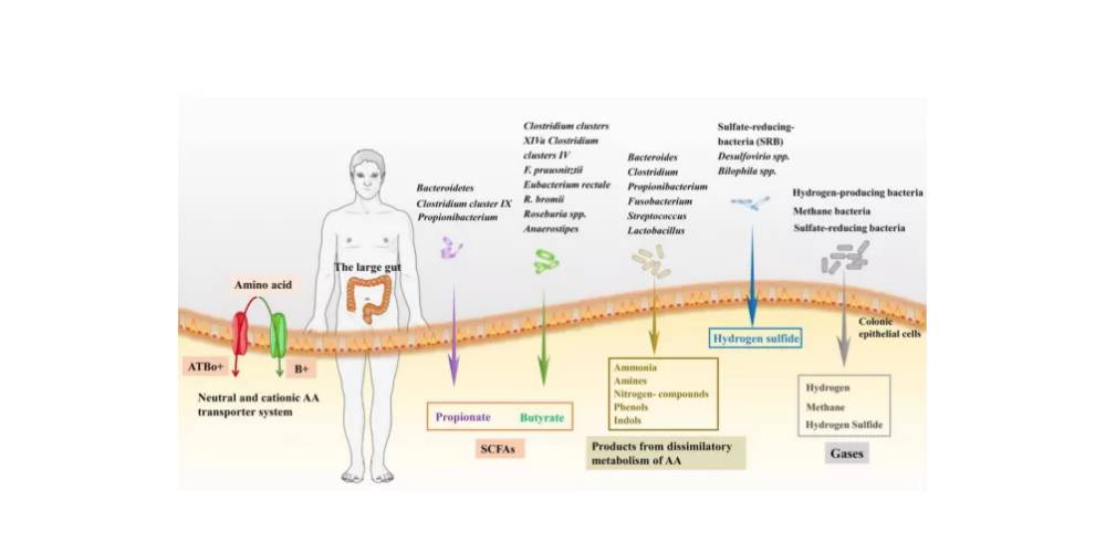 氨基酸(Amino Acids,AAs)是人體必需的物質(zhì),它不僅是蛋白質(zhì)合成的原材料,還可以參與微生物代謝。人體獲取氨基酸不僅可以通過腸道吸收,還可以由微生物代謝產(chǎn)生。不僅如此,氨基酸組成和豐度的變化可影響代謝細(xì)菌群落,并通過TLR受體、NLR受體等調(diào)節(jié)巨噬細(xì)胞和樹突狀細(xì)胞,還可通過AhR受體、5-HT調(diào)節(jié)腸道微生物免疫軸,以及其他信號通路,所有這些通路在直接或間接調(diào)節(jié)腸粘膜免疫和微生物群方面起著關(guān)鍵作用,有助于腸道內(nèi)環(huán)境平衡。[1]