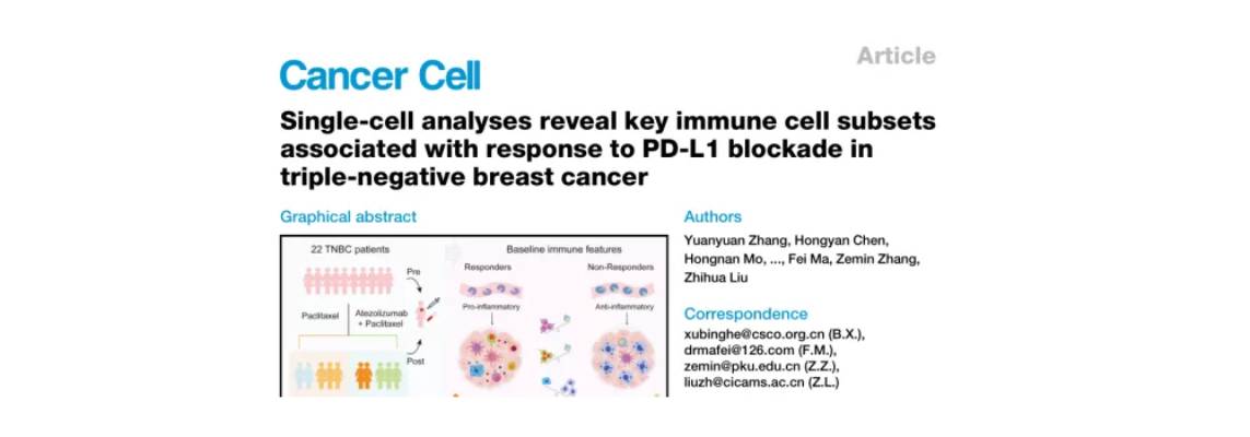 2021年10月14日,中國(guó)醫(yī)學(xué)科學(xué)院腫瘤醫(yī)院聯(lián)合北京大學(xué)生物醫(yī)學(xué)前沿創(chuàng)新中心在國(guó)際期刊Cancer Cell上在線發(fā)表了題為“Single-cell analyses reveal key immune cell subsets associated with response to PD-L1 blockade in triple negative breast cancer”的研究論文,該團(tuán)隊(duì)結(jié)合單細(xì)胞RNA- seq、TCR-seq和ATAC-seq等技術(shù),研究紫杉醇(paclitaxel,化療)聯(lián)合anti-PD-L1抗體阿替利珠單抗(atezolizumab 免疫治療)治療TNBC(三陰性乳腺癌)患者腫瘤微環(huán)境和外周血中的免疫細(xì)胞動(dòng)力學(xué),揭示應(yīng)答者和無(wú)應(yīng)答者的免疫特征,紫杉醇化療聯(lián)合阿替利珠單抗免疫治療在TNBC治療中的機(jī)制和相互作用。