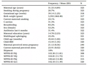 380個(gè)樣本中有364個(gè)成功進(jìn)行了微生物菌群分析(圖1)。在隨后的統(tǒng)計(jì)分析中,排除了一名孕齡較晚的受試者、35名WPPSI-III量表測試方法不準(zhǔn)確的受試者以及5名運(yùn)輸/儲(chǔ)存不規(guī)范的受試者,共323名受試者。對(duì)于其余的家庭,記錄人口統(tǒng)計(jì)資料(母親年齡、兒童年齡、性別),產(chǎn)前、產(chǎn)期和產(chǎn)后因素(胎齡、出生體重、吸煙情況、剖腹產(chǎn)、母乳喂養(yǎng)、母親教育、多語言教育、兒童的BMI、抗生素使用情況)以及認(rèn)知水平(WPSSI-III 總智商(FIQ),言語智商(VIQ)、操作智商(PIQ)和通用語言組合(GLC))(表1)。