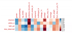 阿爾法多樣性指標(biāo)與認(rèn)知水平之間存在顯著負(fù)相關(guān)。如表3所示,F(xiàn)aith系統(tǒng)發(fā)育多樣性指數(shù)與WPPSI-III FIQ之間的顯著關(guān)聯(lián)。同時(shí)發(fā)現(xiàn)抗生素的使用與Shannon多樣性指數(shù)和Pileou均勻度呈負(fù)相關(guān),妊娠期與Shannon多樣性指數(shù)和觀測到的物種數(shù)呈負(fù)相關(guān),以及C-section與Faith的系統(tǒng)發(fā)育多樣性指數(shù)呈現(xiàn)正相關(guān)(圖S1)。