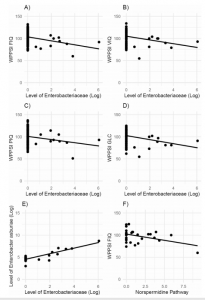 圖2和3表明腸桿菌科的一個(gè)屬(未知屬)的相對(duì)豐度與較低的WPPSI-III FIQ顯著相關(guān)。這個(gè)屬也和WPPSI-III VIQ,PIQ和GLC的低水平得分相關(guān)(圖2 A-D)。后續(xù)分析同時(shí)揭示了另外一個(gè)屬-韋榮球菌科優(yōu)桿菌屬,與WPPSI-III VIQ得分相關(guān)。