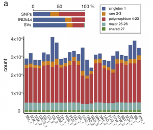 圖2 27個(gè)狗中SNPs、indels和SVs的分布