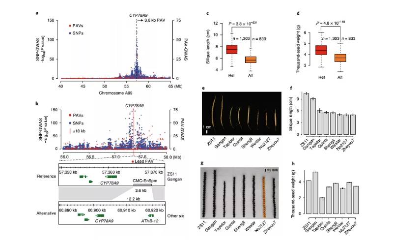 (2)在除水稻以外的作物中也有使用SVs進(jìn)行GWAS的報(bào)道。例如,在玉米中,521個(gè)自交系玉米基因組序列中的SVs被用于繪制玉米SV圖譜;在小麥中發(fā)現(xiàn)了影響染色體3B上基因和轉(zhuǎn)座元件的SV;在最近的一項(xiàng)木瓜研究中(使用栽培木瓜和野生木瓜),共鑒定出8083個(gè)SVs,其中包括5260個(gè)缺失,552個(gè)串聯(lián)重復(fù)和2271個(gè)插入,在該研究中,還發(fā)現(xiàn)CNVs與生長和對環(huán)境壓力的反應(yīng)有關(guān);在油菜中,基于鑒定得到的數(shù)百萬SVs和PAVs用于PAV-GWAS,直接鑒定到了莢果長度、種子重量和開花時(shí)間相關(guān)的結(jié)構(gòu)變異,這些是之前基于單核苷酸變異SNP進(jìn)行的GWAS所沒能鑒定出來的,充分說明了PAV-GWAS可以互補(bǔ)于SNP-GWAS用來鑒定特定性狀相關(guān)的位點(diǎn)(圖7);另外,其他植物SVs鑒定例子包括:溝酸漿屬的耐鹽性、葡萄的漿果顏色和番茄的馴化性狀等研究。