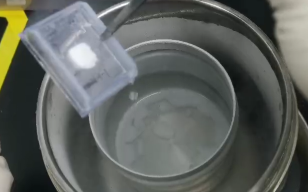 在無菌超凈臺中,用異戊烷(足以完全浸沒組織包埋盒)填充三分之二的金屬燒杯,然后放入液氮杜瓦瓶中(液氮與異戊烷保持相同的水平面)以充分接觸,孵育 5-10 分鐘,時(shí)間不宜太久,防止異戊烷凝結(jié)。