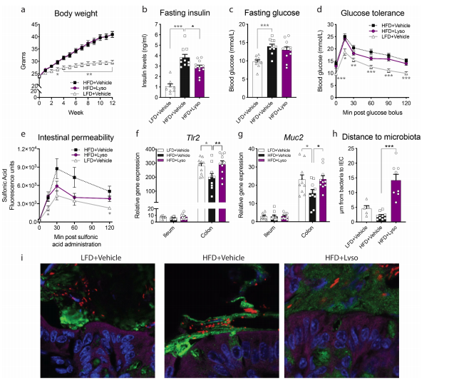 該文章首先研究了溶菌酶對飲食誘導(dǎo)型肥胖小鼠的潛在影響。研究結(jié)果發(fā)現(xiàn),與喂食LFD的小鼠相比,喂食HFD的小鼠體重增加了更多,每天補(bǔ)充溶菌酶對身體成分或能量攝入沒有產(chǎn)生可測量的影響(圖1a),然而,接受溶菌酶治療的小鼠確實表現(xiàn)出了更低的空腹胰島素水平(圖1b)。與Vehicle+HFD組相比,溶菌酶更傾向于降低餐后血糖而不是空腹血糖。葡萄糖刺激的胰島素濃度不受溶菌酶補(bǔ)充的影響。與已知可以調(diào)節(jié)腸道滲漏的空腹胰島素減少類似,本文研究者們在溶菌酶灌胃的動物中觀察到HFD誘導(dǎo)的腸道通透性出現(xiàn)數(shù)值保護(hù)(圖1e)。這些體內(nèi)跡象表明HFD喂養(yǎng)的小鼠腸道通透性增加,且循環(huán)LPS、腸炎癥以及與結(jié)腸和回腸緊密連接基因的表達(dá)在組間保持相似。盡管如此,溶菌酶還是使HFD誘導(dǎo)的結(jié)腸中Tlr2表達(dá)的減少維持在正常范圍內(nèi)(圖1f)。根據(jù)已有研究顯示,TLR2的激活與結(jié)腸杯狀細(xì)胞的黏液調(diào)節(jié)有關(guān),因此本文研究者們調(diào)查了黏液的產(chǎn)生,發(fā)現(xiàn)補(bǔ)充溶菌酶可防止HFD誘導(dǎo)的結(jié)腸Muc2下調(diào)(圖1g)。進(jìn)一步的,發(fā)現(xiàn)這種溶菌酶介導(dǎo)的黏液完整性保存,可能是由于腸上皮細(xì)胞到最近細(xì)菌的平均距離增加6倍以上導(dǎo)致,從而說明補(bǔ)充溶菌酶足以防止HFD引起的微生物區(qū)系侵蝕(圖1h-i)。