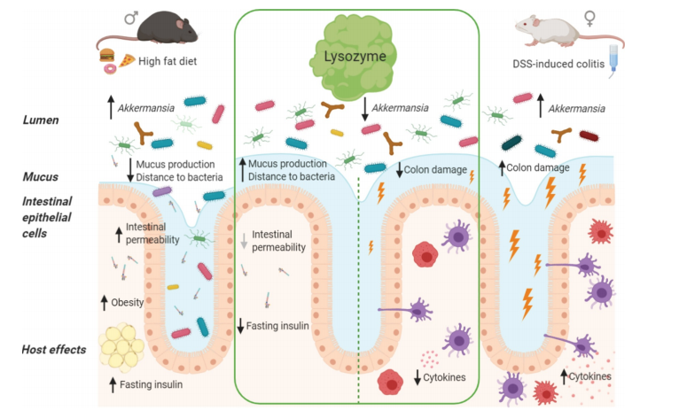 研究發(fā)現(xiàn)溶菌酶可劑量依賴性地減輕DSS刺激小鼠的腸道炎癥,可通過黏液的產(chǎn)生抑制HFD誘導(dǎo)的微生物群侵犯或易位,并可預(yù)防空腹高胰島素血癥。同時研究也發(fā)現(xiàn)溶菌酶保護(hù)腸道健康依賴于一些復(fù)雜的腸道菌群。