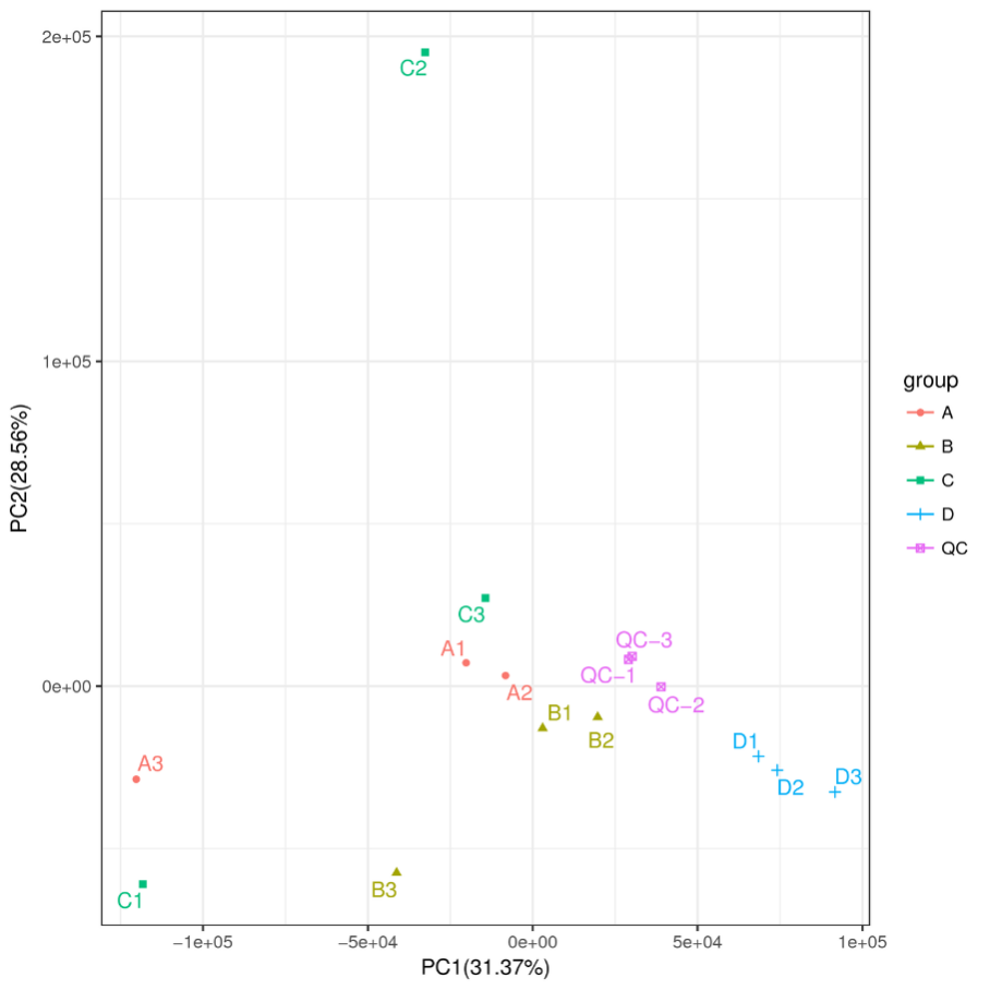 PCA圖現(xiàn)在用形狀和顏色區(qū)分更多的組,一眼就可看到組內和組間的代謝模式差別和聚類結果。同時顯示QC樣本,通過QC更能直觀的儀器的穩(wěn)定性。