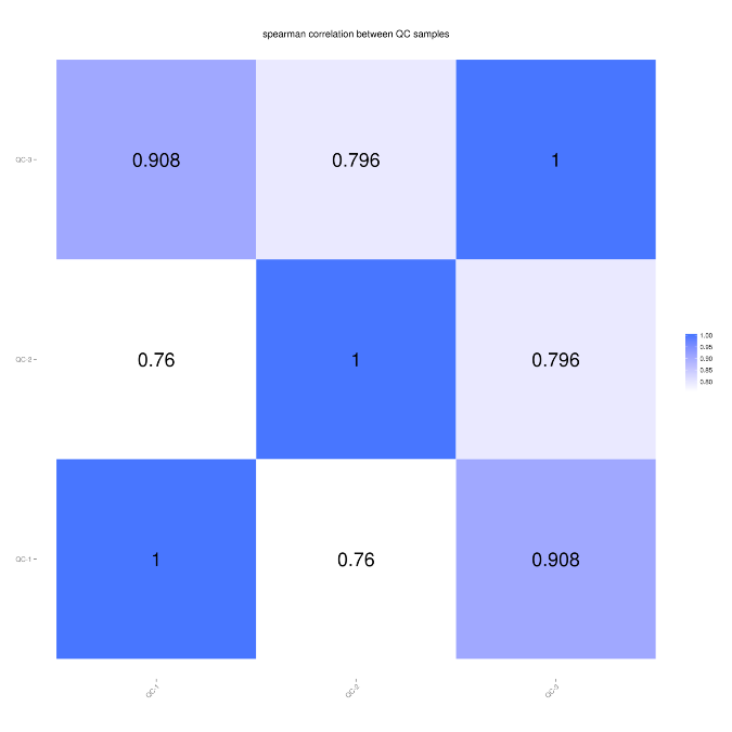 此外,新增QC樣本間的相關性, 通過計算QC樣品之間的相關性分析可以評估下機數(shù)據(jù)整體質量,一般認為QC樣本間相關性>0.75時,數(shù)據(jù)質量較為可靠。