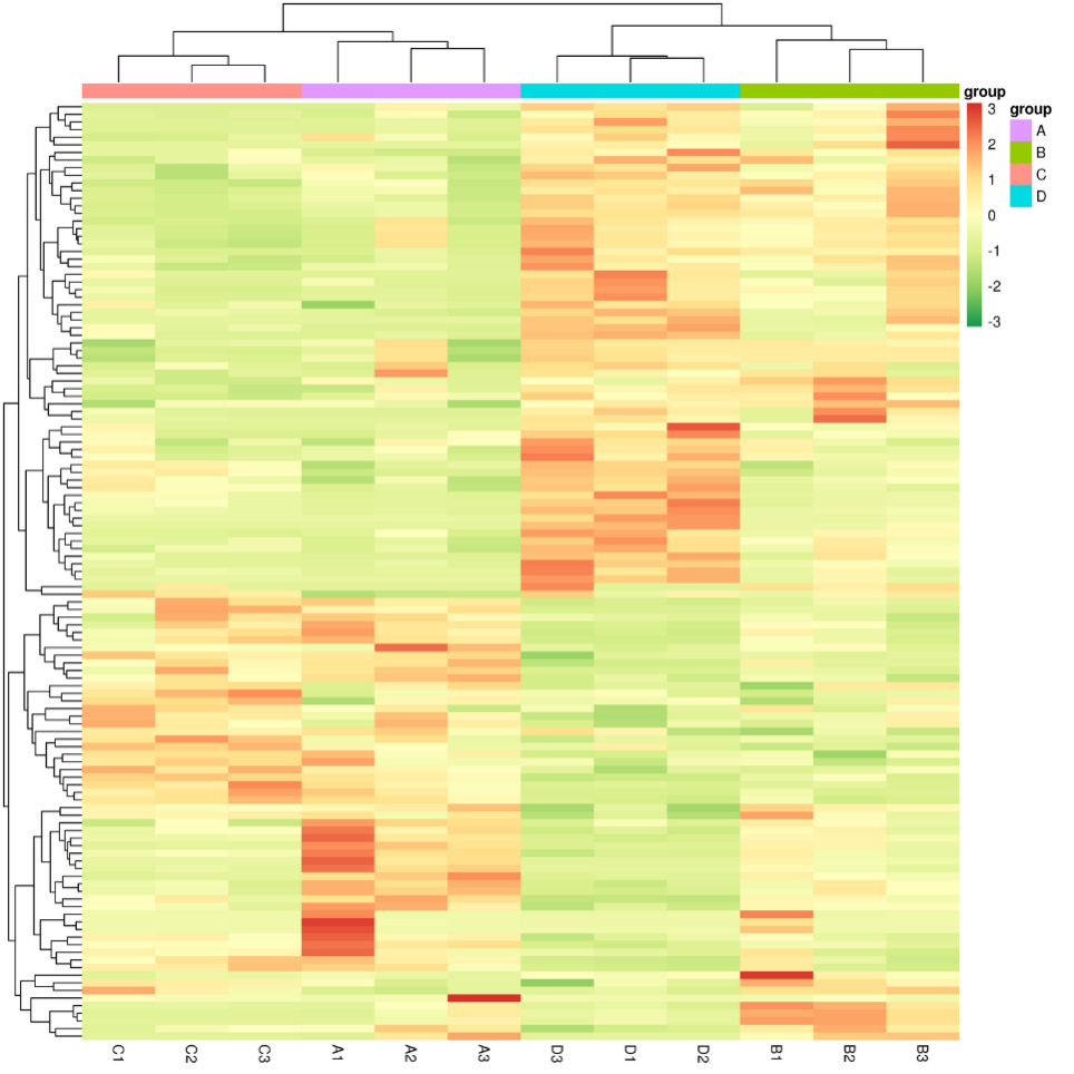 對篩選的差異代謝物繪制層次聚類熱圖,首先將所有比較組合鑒定出的差異代謝物取并集(Union),繪制此集合在所有樣本的聚類熱圖