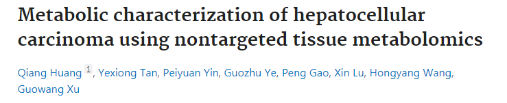 [2] Qiang Huang, Yexiong Tan, Peiyuan Yin, Guozhu Ye, Peng Gao, Xin Lu, Hongyang Wang and Guowang Xu,Metabolic Characterization of Hepatocellular Carcinoma Using Nontargeted Tissue Metabolomics. Cancer Res August 15 2013 (73) (16) 4992-5002; DOI: 10.1158/0008-5472.CAN-13-0308.