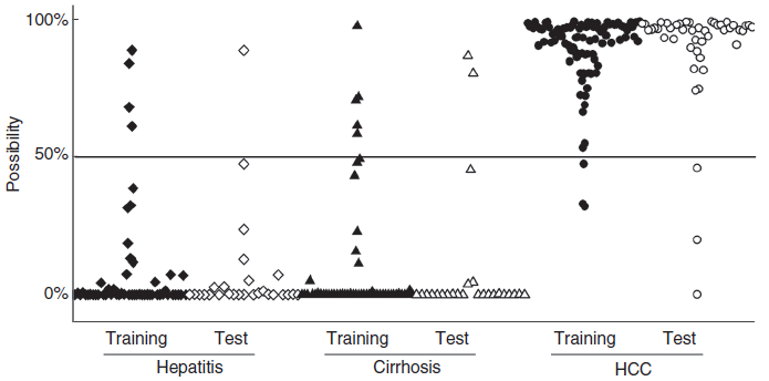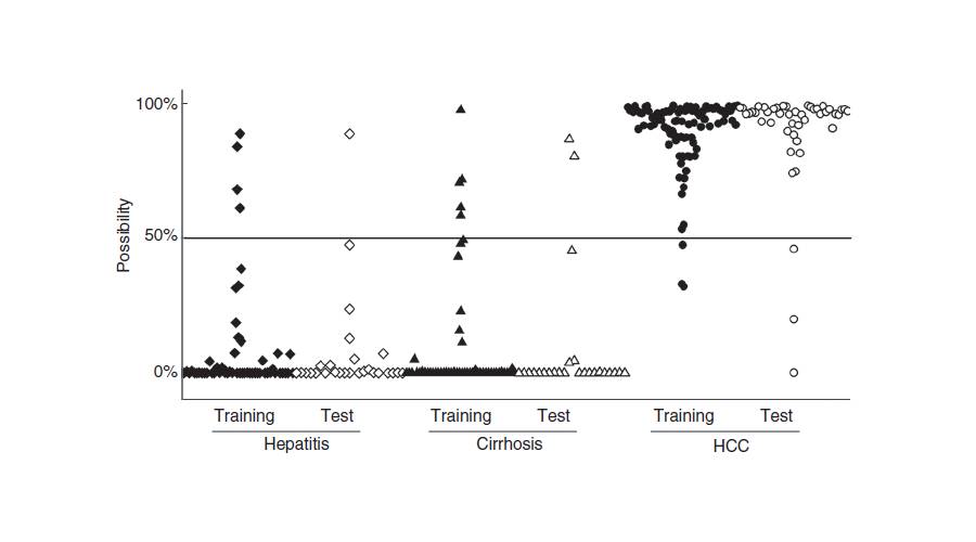 為了評價和驗證篩選出的差異物是否具有良好的診斷能力,進行內(nèi)部驗證,即將發(fā)現(xiàn)隊列的298例樣本中的一部分樣本作為訓練集(training set)用來構(gòu)建診斷模型,剩余的樣本作為測試集(test set)用來測試篩選出的標志物的診斷能力。結(jié)果如圖所示:在訓練集中,模型對慢性肝病和肝癌診斷的準確性分別達到91.6%和96.8%,表明模型建立良好。在測試集中,模型對慢性肝病和肝癌診斷的準確性分別達到94.2%和93.5%,表明篩選到的標志物診斷能力良好。