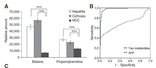 甜菜堿、丙酰肉堿組合能夠?qū)Ω闻K疾病進行良好的預測,可以作為臨床肝癌的診斷標志物甲胎蛋白AFP的補充診斷手段。