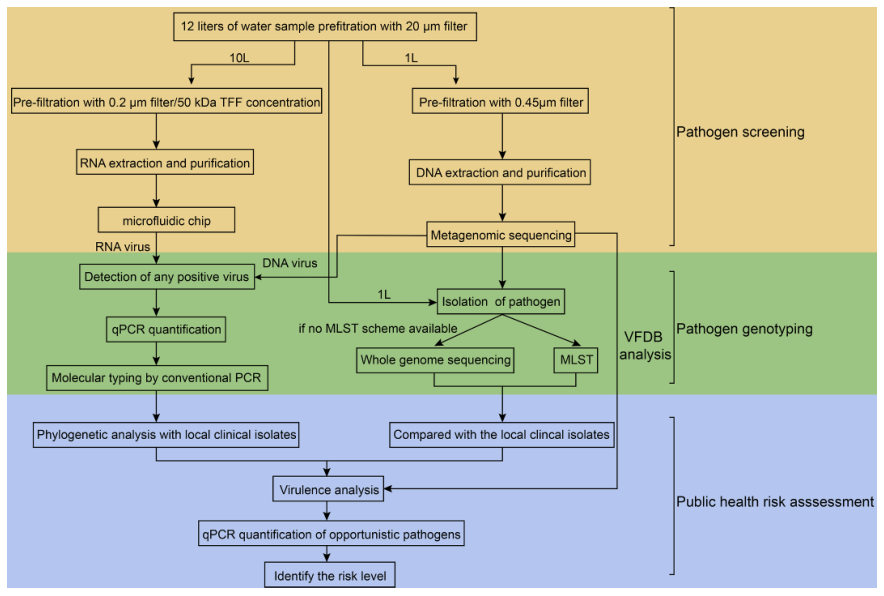 水生病原體可引起嚴重疾病,如霍亂、鉤端螺旋體病、傷寒或腹瀉。鑒于這些新出現(xiàn)的疾病的不可預(yù)測性和高度多樣性,水傳播病原體監(jiān)測的關(guān)鍵挑戰(zhàn)之一是優(yōu)先為局部暴發(fā)做好準備。為應(yīng)對這些挑戰(zhàn),該研究分三個步驟進行公共衛(wèi)生風險評估:潛在病原體篩選、病原基因型確認、與當?shù)嘏R床資料比較。