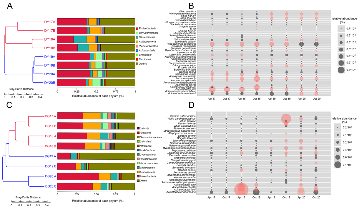A:DY細菌群落相對豐度;B:DG中細菌群落相對豐度;C:DY樣品中細菌病原體的動態(tài);D:DG樣品中細菌病原體的動態(tài)