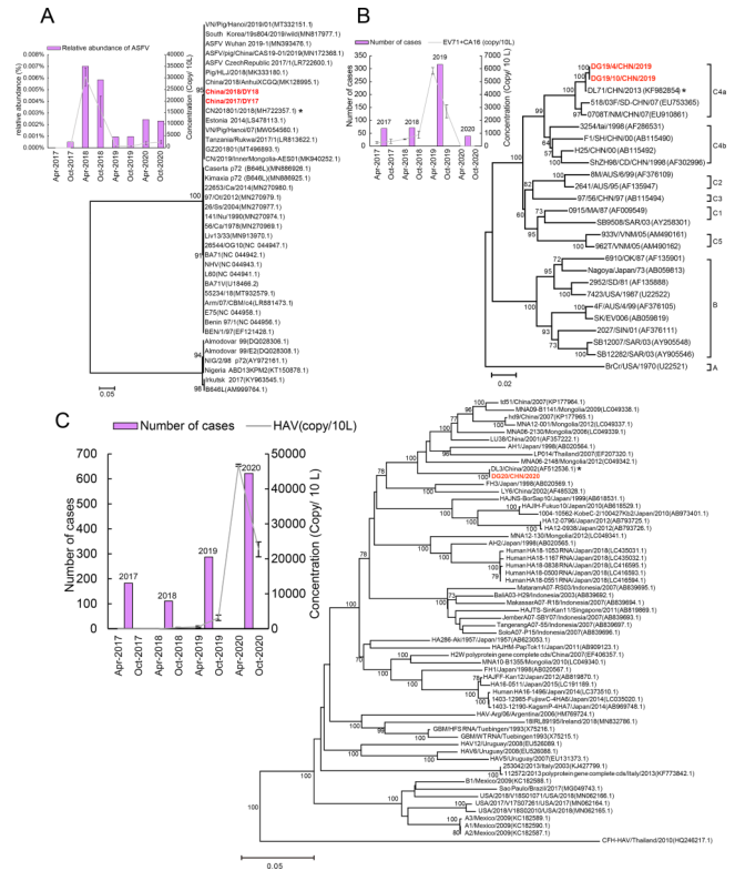 在DY發(fā)現(xiàn)了非洲豬瘟病毒(ASFV)和豬痘病毒(Swinpox Virus)等幾種病毒。ASFV在2017年10月被檢測到,并在2018年達到頂峰(圖6A),并通過qPCR證實。qPCR在2018年4月后連續(xù)檢測到ASFV,其中2018年4月的病毒載量為3.0×103拷貝/L。在DG地點未檢測到ASFV和Swinpox病毒,在兩個地點均未檢測到其它人畜共患病DNA病毒。通過高通量微流控芯片檢測檢測了40種致病性RNA病毒的存在。DY樣品中,經(jīng)qPCR確認,2019年僅檢測到諾如病毒、流行性腮腺炎病毒、鼻病毒和Human herpesvirus 6病毒。DG樣品中,2017年至2019年在樣本中檢測到human enterovirus 71 (EV71),2020年4月檢測到Coxsackievirus 16 (CA16)。