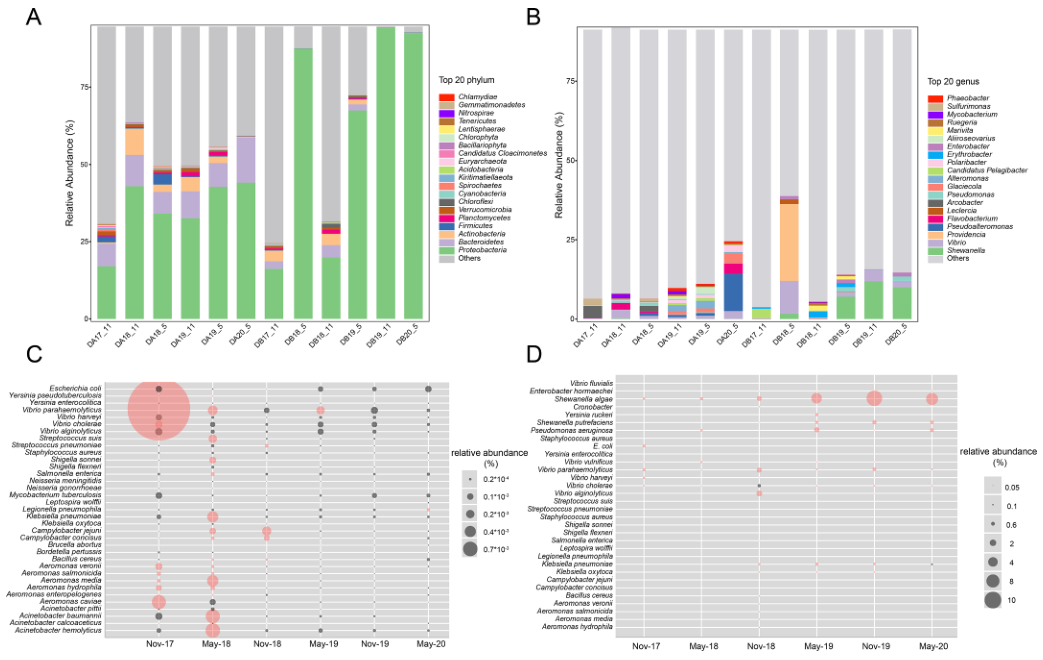 宏基因組數(shù)據(jù)中大約90%的reads與細菌相對應(yīng)。DA樣品中,變形菌門數(shù)量最多,其次是疣微菌門和放線菌(分別為35%和58%)(圖4A)。DB樣品中,變形菌門從2017年的50.1%增加到2020年的84.7%(圖4A)。兩個地點的微生物組成自2018年11月后出現(xiàn)了差異。在每個采樣時間,豐度 top20屬代表了微生物群落的35%到57%(圖5B)。在2019年(5.8%)和2020年(4.8%)采集的樣品中發(fā)現(xiàn)了弧菌屬(Arcobacter),而氣單胞菌屬(Aeromonas)和弧菌屬(Vibrio Spp)在2017年11月達到峰值(分別為0.43%和4.1%),在DA中還檢測到其它幾種細菌病原體(圖5C),所有時間均檢出假結(jié)核耶爾森菌(Yersinia pseudotuberculosis),2018年5月達到峰值(0.00013%),其他菌種也達到峰值,如不動桿菌屬、肺炎克雷伯菌屬等?;谂囵B(yǎng)的分析證實,DA和DB位點分別存在22種和18種致病物種(圖5C,D)。對兩個城市的宏基因組數(shù)據(jù)進行直接分類。每個數(shù)據(jù)集中的宏基因組組裝基因組(MAG)數(shù)量從7到23個不等,相對豐度在0.215%到1.325%之間。然而,對MAGs的注釋結(jié)果表明,它們都不含有毒力因子,說明該方法只能檢測高豐度的病原體。