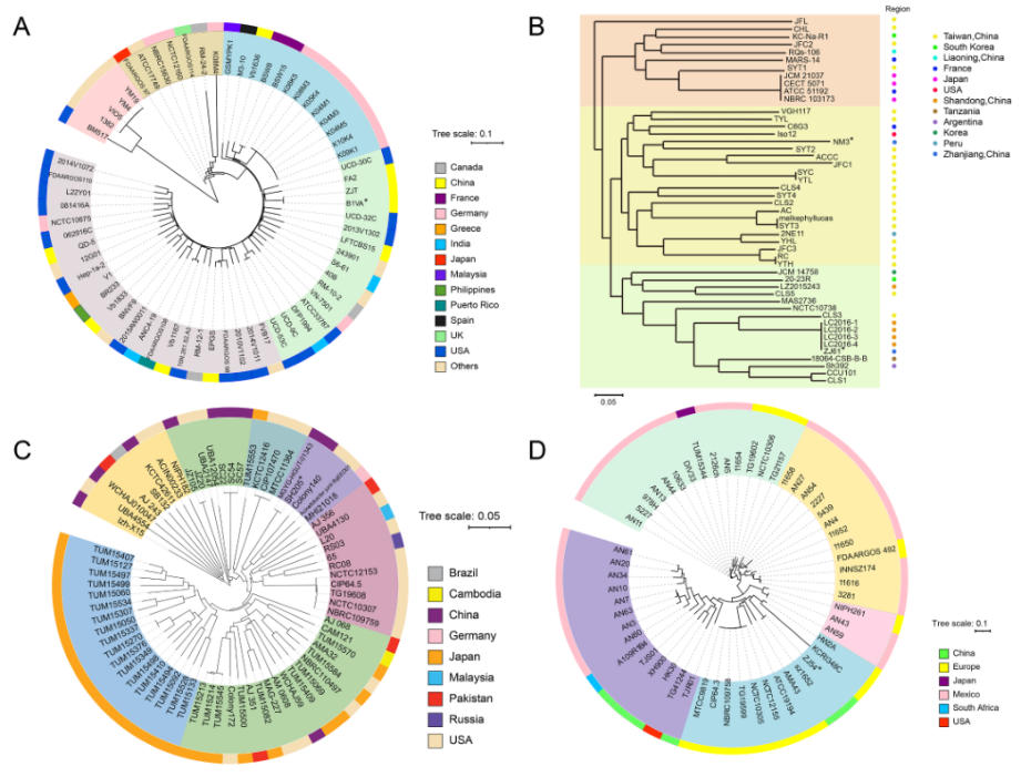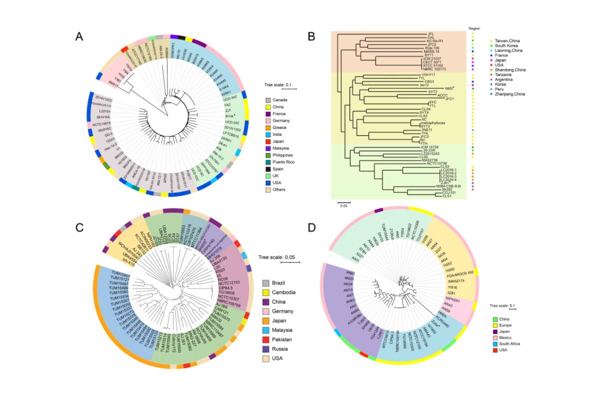 圖5.根據(jù)Vibrio alginolyticus (A)Shewanella algae (B) Acinetobacter junii (C) Acinetobacter haemolyticus (D)核心基因組序列,
