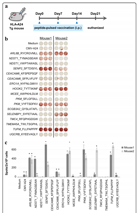 為了評估從異常剪接亞型和移碼突變中鑒定的肽的抗原性,作者根據(jù)圖6a所示的方案用候選肽免疫HLA-A24轉(zhuǎn)基因小鼠。作者根據(jù)人類白細(xì)胞抗原-α:24:02的網(wǎng)絡(luò)MHC評分選擇了17種候選肽(表2)。作者通過BLAST-P證實(shí)了該肽序列與人或小鼠蛋白質(zhì)數(shù)據(jù)庫中的序列沒有相似性,最后一次接種疫苗一周后,作者從小鼠中分離出脾細(xì)胞,并對分離物進(jìn)行酶聯(lián)免疫吸附斑點(diǎn)(ELISpot)分析。通過這樣做,作者試圖檢測新抗原特異性脾淋巴細(xì)胞反應(yīng)。酶聯(lián)免疫吸附試驗(yàn)結(jié)果顯示,17個(gè)多肽中有8個(gè)誘導(dǎo)顯著高的干擾素-γ產(chǎn)生(n= 2)與PBS組和單獨(dú)佐劑組相比(圖6b,c)。這些結(jié)果表明,來自剪接亞型和移碼突變的多肽可以通過與人類白細(xì)胞抗原的相互作用激活T細(xì)胞反應(yīng)。