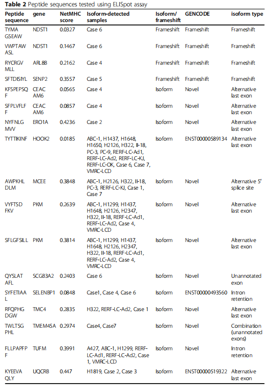 結(jié)果:對22組細(xì)胞系進(jìn)行全長轉(zhuǎn)錄組測序,共鑒定出2021種新的剪接異構(gòu)體。其中一些異構(gòu)體的蛋白質(zhì)表達(dá)通過蛋白質(zhì)組分析進(jìn)行驗(yàn)證。無義介導(dǎo)的mRNA衰減因子(NMD)UPF1的降低和剪接因子SF3B1的減少增加了異常轉(zhuǎn)錄本的比例。NetMHC對每種HLA分子結(jié)合的親和力的評估顯示,一些亞型可能產(chǎn)生新抗原候選體,還在7個(gè)非小細(xì)胞肺癌標(biāo)本中發(fā)現(xiàn)了剪接亞型。酶聯(lián)免疫吸附斑點(diǎn)試驗(yàn)表明,大約一半的候選肽有可能通過與人類白細(xì)胞抗原分子的相互作用激活T細(xì)胞反應(yīng)。大約一半的多肽通過與HLA分子的相互作用具有激活T細(xì)胞反應(yīng)的潛力。最后,作者通過參考構(gòu)建的目錄來估計(jì)癌癥基因組圖譜(TCGA)數(shù)據(jù)庫中的亞型數(shù)量,發(fā)現(xiàn)NMD因子的破壞與TCGA-Lung Adenocarcinoma數(shù)據(jù)集中發(fā)現(xiàn)的剪接亞型數(shù)量顯著相關(guān)。