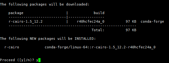 然后嘗試conda install -c conda-forge r-cairo(注意包的名字用小寫字母)來(lái)安裝。出來(lái)這個(gè)敲y,一般都能安裝成功。conda安裝R包首先要安裝有conda,然后激活conda環(huán)境,在命令行而不是交互界面去安裝。