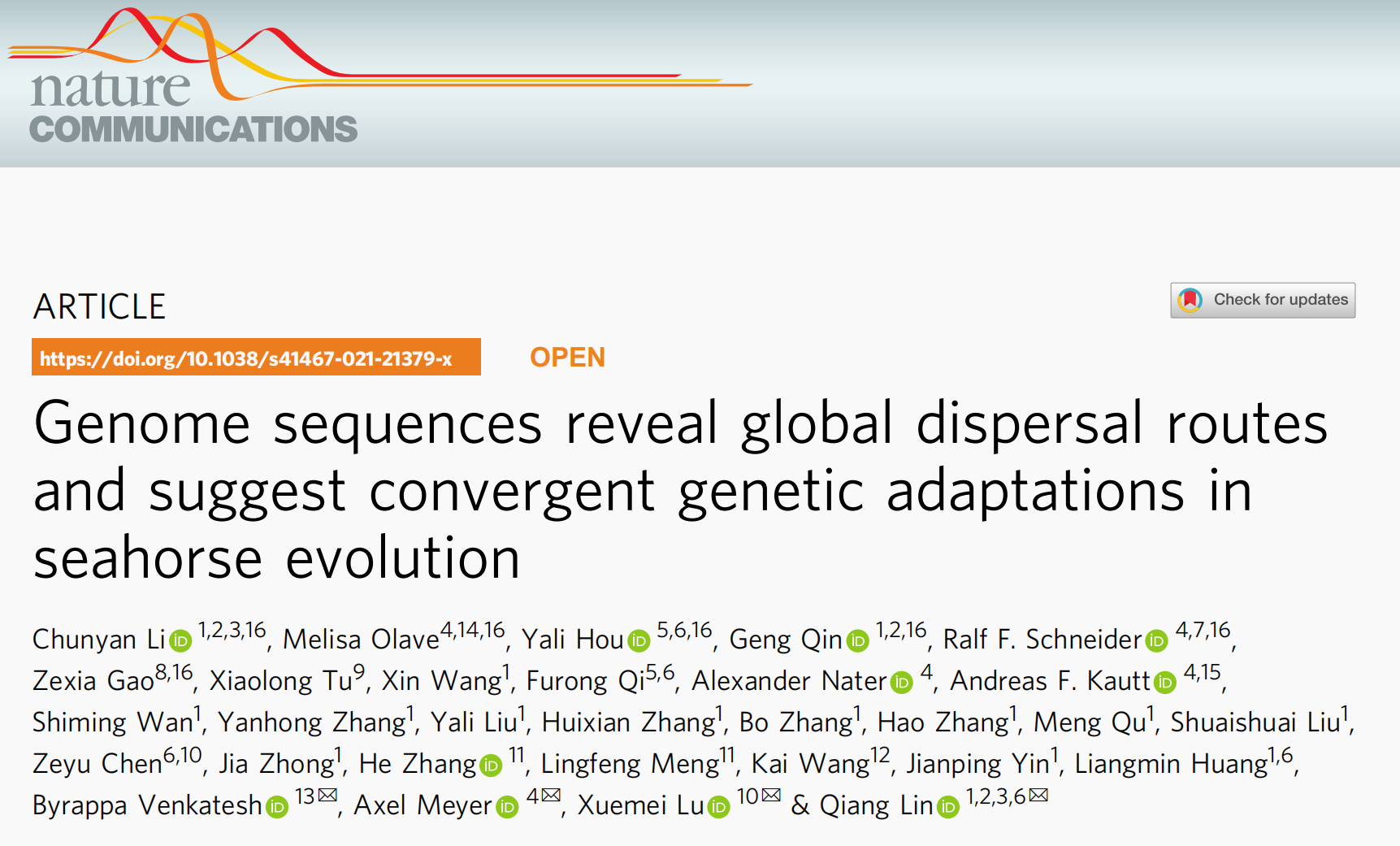 本研究利用PacBio和Hi-C技術(shù)重新組裝了雄性直立海馬的基因組,其組裝大小為420.66 Mb,contig N50=15.5Mb。并通過包含21個(gè)不同海馬種的358個(gè)海馬標(biāo)本重測(cè)序與進(jìn)化關(guān)系分析,研究了海馬在世界范圍內(nèi)的分布和生物地理格局。研究發(fā)現(xiàn)海馬在晚漸新世進(jìn)化,展示了其隨后的全球定居路線,并表示這種特征與洋流動(dòng)態(tài)變化和古時(shí)期的海道開口有關(guān)。此外,反復(fù)出現(xiàn)的“骨刺”適應(yīng)性表型的遺傳基礎(chǔ)與一個(gè)關(guān)鍵發(fā)育基因的獨(dú)立替代有關(guān)。因此,分析表明,通過洋流漂流可以彌補(bǔ)分散性差的缺陷,并且快速適應(yīng)有利于海馬開拓新的棲息地。