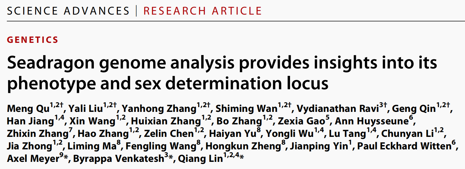 本研究完成雌雄性海龍基因組的破譯,草海龍最終組裝大小為 ~659 Mb(♂)與 ~663 Mb(♀), contig N50分別為10.0 Mb與12.1 Mb。綠海龍分別組裝~637 Mb(♂)與~648 Mb(♀),contig N50分別為18.0Mb與21.0 Mb。通過系統(tǒng)發(fā)育分析,明確草海龍與綠海龍?jiān)谙到y(tǒng)發(fā)育地位上屬于海龍亞科(Syngnathinae)的姊妹群,并于27.3 百萬年前左右發(fā)生分化。進(jìn)一步通過結(jié)合重測(cè)序分析、轉(zhuǎn)錄分析、比較基因組分析等研究揭示了草海龍適應(yīng)性進(jìn)化產(chǎn)物附葉的快速愈合和再生能力相關(guān)基因,以及海龍科物種性別決定基因的產(chǎn)生和演化歷程,為海洋魚類的環(huán)境適應(yīng)性進(jìn)化研究提供了重要理論依據(jù)。