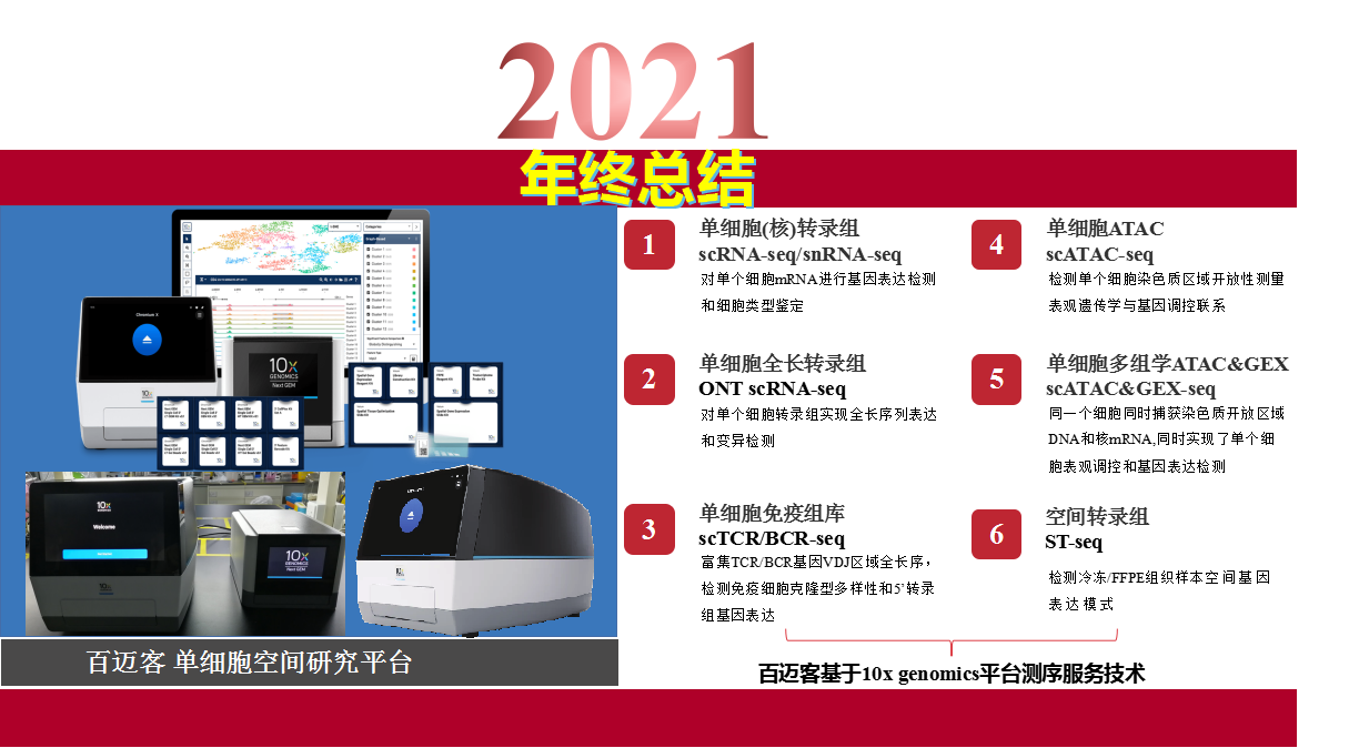 百邁客剛剛回顧了2021年重大成果產(chǎn)出,其中包括通量/質(zhì)量雙升級、科研產(chǎn)出3000+分、生物云+智能制造創(chuàng)新開啟新征程、上萬人次行業(yè)交流等幾個方面重大事件,可見2021是豐收的一年,是成長的一年。百邁客單細(xì)胞系列產(chǎn)品也同樣迎來新臺階,實(shí)現(xiàn)了平臺的快速發(fā)展,讓我們一起重溫單細(xì)胞產(chǎn)品部2021的那些大小事件。