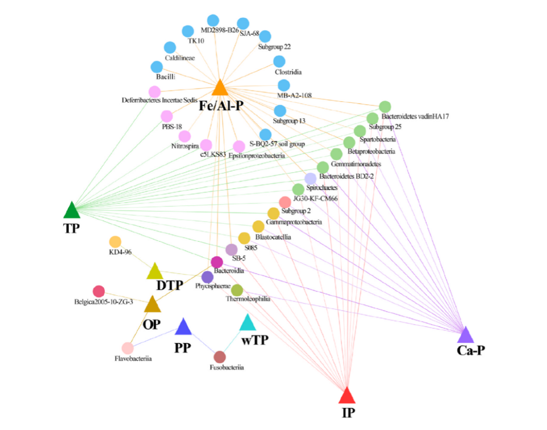 圖4?網(wǎng)絡(luò)分析顯示35個(gè)細(xì)菌群落在級(jí)別上(用圓圈表示)和8個(gè)不同的磷形式(用三角形表示)之間有很強(qiáng)的相關(guān)性
