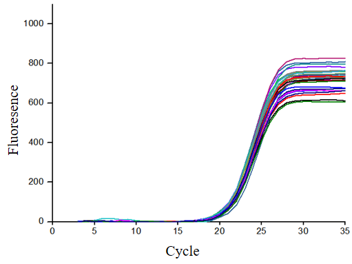 2.重復(fù)性檢測:分別設(shè)置30個復(fù)孔,擴(kuò)增相同的基因,發(fā)現(xiàn)擴(kuò)增曲線的Ct值幾乎一致。