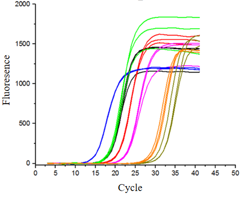 圖3:物種多樣性檢測:分別以不同物種、不同濃度的RNA為模板,進(jìn)行一步法RT-qPCR擴(kuò)增。包括人肝癌(藍(lán)色);果蠅(綠色);小鼠腸道(黑色);番茄果(紅色);日本水稻(紫色);辣椒(橙色);石斑魚(灰色)。