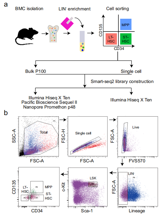 樣本制備:8-9周的雌性成年C57BL/6 J 小鼠,從股骨和脛骨中分離骨髓細(xì)胞。首先使用小鼠造血干細(xì)胞分離試劑盒富集造血干細(xì)胞和祖細(xì)胞(HSPC)。長(zhǎng)期(LT)和短期(ST)造血干細(xì)胞(HSC)和多能祖細(xì)胞(MPP)根據(jù)其表面標(biāo)志物進(jìn)行分選。對(duì)于單細(xì)胞RNA測(cè)序(scRNA-seq),將細(xì)胞單獨(dú)分選到含有裂解緩沖液的8條PCR管中。同時(shí)對(duì)于批量RNA-seq,分選100個(gè)細(xì)胞(P100)到一個(gè)PCR管中作為生物學(xué)重復(fù)。