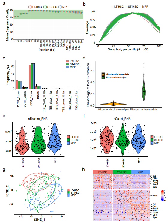 對(duì)于批量RNA測(cè)序,PCA分析顯示三種細(xì)胞類(lèi)型在PC1軸上分離,PC1的變異率為53.73%(圖3d)。與單細(xì)胞數(shù)據(jù)相似,ST-HSC位于LT-HSC和MPP之間,與它們的生物學(xué)狀態(tài)相對(duì)應(yīng)。綜上所述,這些結(jié)果表明細(xì)胞被正確分選,批量和單細(xì)胞短讀長(zhǎng)RNA-seq數(shù)據(jù)的質(zhì)量都很高。