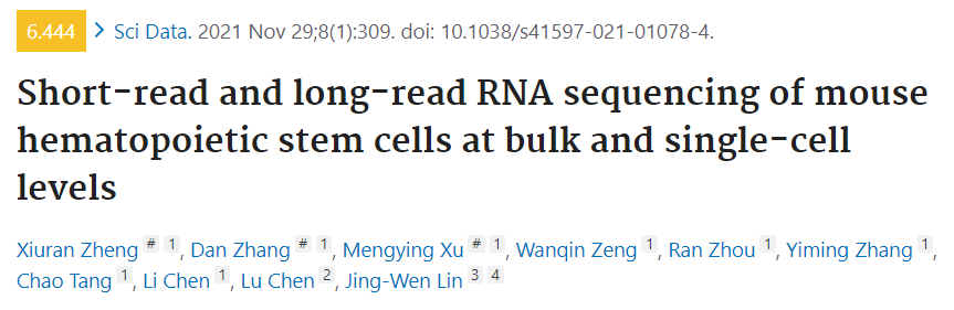Zheng X, Zhang D, Xu M, et al. Short-read and long-read RNA sequencing of mouse hematopoietic stem cells at bulk and single-cell levels. Sci Data. 2021;8(1):309. Published 2021 Nov 29. doi:10.1038/s41597-021-01078-4