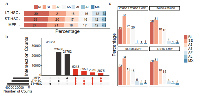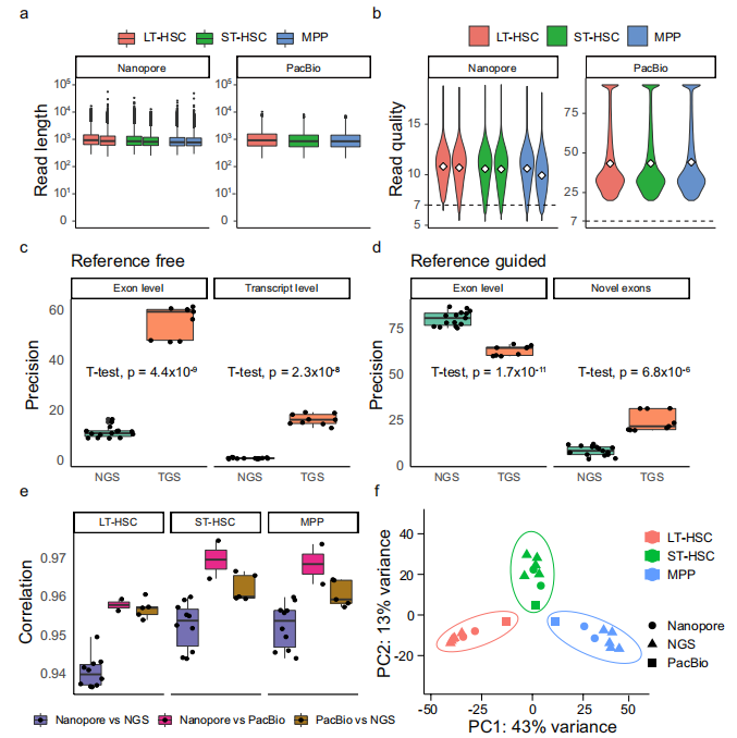 利用短讀長(zhǎng)下一代測(cè)序(NGS)或長(zhǎng)讀長(zhǎng)測(cè)序(如PacBio和Oxford Nanopore Technologies)的RNA測(cè)序,是解讀包括血細(xì)胞生成在內(nèi)的各種生物過(guò)程中的轉(zhuǎn)錄多樣性和調(diào)控機(jī)制的強(qiáng)大工具。雖然NGS在表達(dá)定量方面更可靠,但是短讀長(zhǎng)在AS事件中只能提供有限的信息。相比之下,長(zhǎng)讀長(zhǎng)的測(cè)序方法提供了一個(gè)獨(dú)特的機(jī)會(huì),可以實(shí)現(xiàn)在提供全長(zhǎng)信息的基礎(chǔ)上檢測(cè)可變剪接異構(gòu)體。本文使用短讀長(zhǎng)和長(zhǎng)讀長(zhǎng)RNA測(cè)序,在批量和單細(xì)胞水平上對(duì)小鼠HSC和MPP進(jìn)行了全面的轉(zhuǎn)錄圖譜分析。