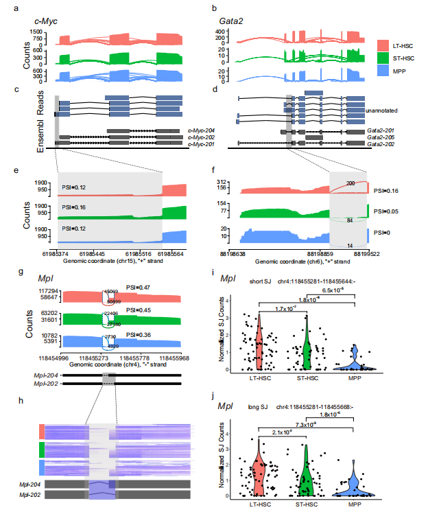 為了進(jìn)一步確認(rèn)長(zhǎng)讀長(zhǎng)在識(shí)別可變剪接異構(gòu)體方面的優(yōu)勢(shì),使用納米孔和PacBio測(cè)序數(shù)據(jù)對(duì)三種細(xì)胞類(lèi)型中已知的LT-HSC的標(biāo)志物c-Myc和Gata2(圖2h)的轉(zhuǎn)錄本進(jìn)行了可視化。接下來(lái)篩選了所有映射到基因c-Myc和Gata2及其注釋的轉(zhuǎn)錄本上的reads。發(fā)現(xiàn)2915個(gè)reads覆蓋到了c-Myc,且LT-HSC的reads數(shù)*多(圖6a)。在納米孔和PacBio測(cè)序數(shù)據(jù)中可視化了全長(zhǎng)轉(zhuǎn)錄本的reads,發(fā)現(xiàn)所有注釋的亞型都能被鑒定識(shí)別(圖6c)。在c-Myc第一個(gè)外顯子中發(fā)現(xiàn)了一個(gè)5 ‘的可變剪接起始位點(diǎn)。使用短讀長(zhǎng)測(cè)序數(shù)據(jù)來(lái)定量該基因座的剪接百分比(PSI),發(fā)現(xiàn)較長(zhǎng)的異構(gòu)體在所有三種細(xì)胞類(lèi)型中具有相似的 PSI(剪接百分比),ST-HSC中包含第一個(gè)外顯子的較長(zhǎng)異構(gòu)體的reads占比比較高(圖6 e)。對(duì)于Gata2來(lái)說(shuō),發(fā)現(xiàn)覆蓋有595個(gè)reads,在LT-HSC中比其他兩種細(xì)胞類(lèi)型多了近20倍的reads數(shù)(圖6b)。通過(guò)對(duì)比全長(zhǎng)reads和注釋的轉(zhuǎn)錄本,發(fā)現(xiàn)在LT-HSC中Ensembl的轉(zhuǎn)錄本中有一個(gè)未注釋的內(nèi)含子保留(圖6d)。隨后利用短讀長(zhǎng)測(cè)序數(shù)據(jù)驗(yàn)證驗(yàn)證了這種內(nèi)含子保留并定量這個(gè)內(nèi)含子的PSI值,發(fā)現(xiàn)該內(nèi)含子在LT-HSC中PSI值*高(圖6f)。接下來(lái)展示將長(zhǎng)讀長(zhǎng)測(cè)序與單細(xì)胞RNA-seq結(jié)合的數(shù)據(jù)示例,從長(zhǎng)讀長(zhǎng)測(cè)序數(shù)據(jù)中鑒定到了一個(gè)在Mpl中具有24 bp可變剪接區(qū)域的可5’剪接位點(diǎn)(A5)?;赟mart-seq2的測(cè)序數(shù)據(jù)發(fā)現(xiàn)這個(gè)剪接事件在不同細(xì)胞類(lèi)型中是差異的,其PSI值從LT-HSC,ST-HSC到MPP是依次遞減的(圖6g-j)。使用Smart-seq2數(shù)據(jù)可以觀察到單個(gè)細(xì)胞間的異質(zhì)性(圖6h),在造血過(guò)程中,所涉及的長(zhǎng)和短剪接位點(diǎn)(SJ)是被顯著下調(diào)的(圖6i,j)。這些結(jié)果表明,整合短讀長(zhǎng)和長(zhǎng)讀長(zhǎng)測(cè)序有助于識(shí)別差異表達(dá)的異構(gòu)體。