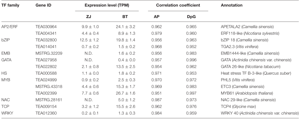上述結(jié)果表明,在紫色花朵中,具有特征的揮發(fā)性和非揮發(fā)性BPs分別為AP和DpG。計算了Ps和TFs之間的皮爾遜相關(guān)系數(shù),發(fā)現(xiàn)這兩個茶葉品種之間存在顯著差異。AP和DpG的14個TF的相關(guān)系數(shù)大于0.95(表1)。他們屬于AP2/ERF、bZIP、EMP、GATA、HS、MYB、NAC、TCP和WRKY家族,在紫色花種分別高出1.6–6.7倍,其中MYB、AP2/ERF、bZIP、TCP和GATA的表達(dá)水平高。