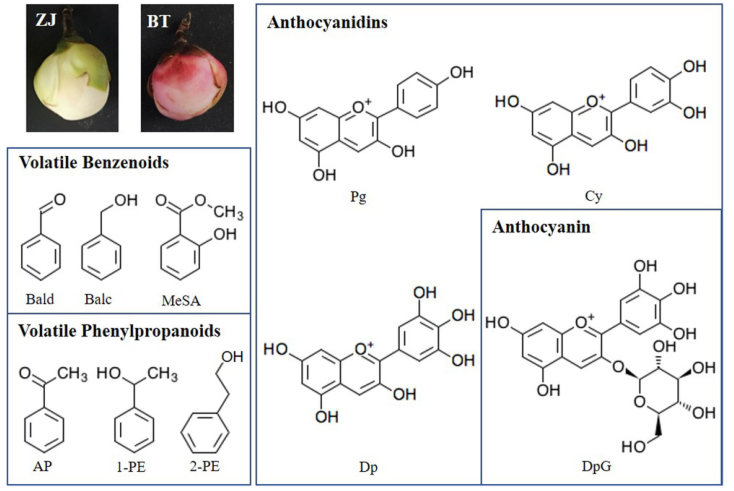 在這項研究中,為了研究揮發(fā)性和非揮發(fā)性BPs對紫色茶花的氣味和顏色的作用,在白色(ZJ品種)和紫色(BT品種)茶花瓣中測定了BP型香氣和花青素(圖1),確定了生物合成和花青素運輸相關(guān)途徑中的基因表達(dá)譜,并分析了調(diào)節(jié)ZJ和BT之間氣味和顏色變化可能的TFs。