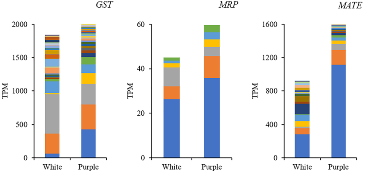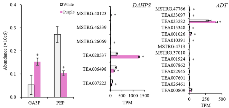 為了進(jìn)一步揭示兩個茶樹品種之間BPs的不同合成機制,檢測了上游化合物和基因(圖5)。在紫色花瓣中,3-磷酸甘油醛(GA3P)增加了2.9倍,而磷酸烯醇式丙酮酸(PEP)僅為白色花瓣的38%,這表明紫色花瓣中的碳代謝被促進(jìn),但它可能不會進(jìn)入苯丙氨酸的下游代謝。PEP的降低可能是由于高度誘導(dǎo)的3-脫氧-D-阿拉伯庚糖酸7-磷酸合成酶(DAHPS)所致。在紫色花瓣中,DAHPS基因的主要成員TEA028537的表達(dá)量高出4.6倍。芳醇脫水酶/預(yù)苯酸脫水酶(ADT)催化芳醇生成苯丙氨酸。它的主要成員TEA033282在紫色花瓣中略微升高,高出1.3倍。此外,合成的花青素在顯示顏色之前需要運輸?shù)揭号葜?,該過程與谷胱甘肽S-轉(zhuǎn)移酶(GST)、多藥耐藥相關(guān)蛋白(MRP)以及多藥和毒素擠壓(MATE)有關(guān)。把這些顯著差異基因的表達(dá)量加起來,發(fā)現(xiàn)紫色花瓣的總表達(dá)量都較高,分別高出1.1, 1. 3和1.7倍。紫色花瓣中這三個基因的主要成員(TEA015341、TEA001531和TEA006958),表達(dá)量分別高出6.9, 1. 4,和3.9倍。