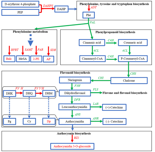 苯類化合物,尤其是苯丙烷,是植物顏色和香氣的主要來源,它們幫助植物吸引傳粉動物或阻止外敵侵害。類苯和類苯丙烷(BPs),例如類黃酮,是一組次級代謝產(chǎn)物,來源于莽草酸途徑中的兩種芳香族氨基酸苯丙氨酸(Phe)和酪氨酸。