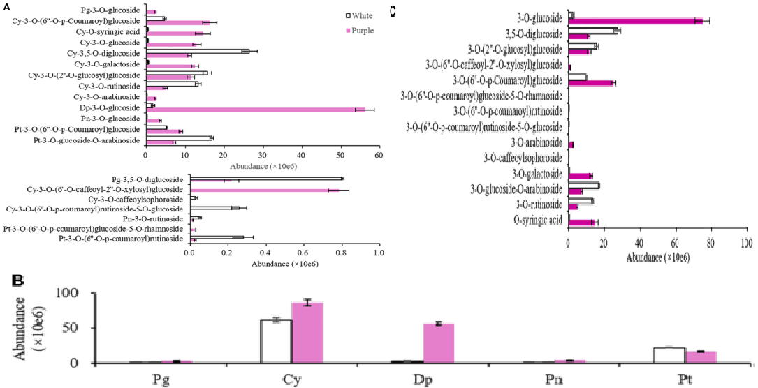 Dp只有一種糖苷形式,但它在紫色花瓣中含量豐富。紫色花瓣中的主要花色苷是delphinidin-3-O-glucoside,Cy-3-O-(6’’-O-p-coumaroyl)glucoside, ?Cy-O-syringic ?acid, Cy-3-O-glucoside和Cy-3-O-galactoside,?而在白色茶花中,則是 Cy-3,5-O-diglucoside, Pt-3-O-glucoside-O-arabinoside,? Cy-3-O-(2’’-O-glucosyl)glucoside和 Cy-3-O-rutinoside 。除苷元外,這20種花青素中的另一半含有13種糖苷和1種丁香酸(圖3C)。在白色花瓣中,花青素含量高的是3,5-O-二葡萄糖苷,而在紫色花瓣中,3-O-葡萄糖苷含量極高。因此,兩個茶樹品種之間花青素的大差異是DpG,這可能是紫色花呈紫色的主要原因,以及紫色花瓣中Dp和葡萄糖的生物合成可能已增強。