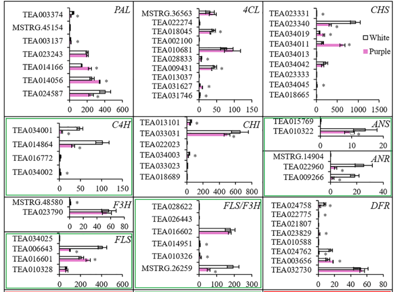 圖8 紫色與白色茶花中BPs合成相關(guān)基因的表達(dá)譜比較;綠色和紅色箭頭分別表示紫色花瓣中較低和較高的部分