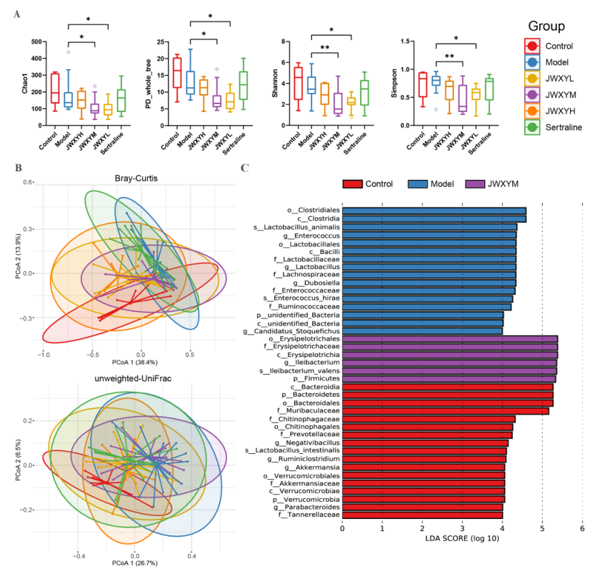 圖3.(A)不同群體的阿爾法多樣性指數(shù)(Chao1、PD_Whole_Tree.、Shannon、Simpson)的變化。(B)不同組樣本的beta多樣性指數(shù)(Bray-Curtis,未加權(quán)UniFrac)的特征。(C)基于對(duì)照組、模型組和JWXYM組之間的Lefse分析,確定腸道微生物組的潛在生物標(biāo)志物。