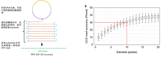 PB全長(zhǎng)多樣性測(cè)序基于HIFI模式對(duì)單一片段進(jìn)行多輪測(cè)序的方式來提升準(zhǔn)確性。由于PacBio的原始錯(cuò)誤為隨機(jī)錯(cuò)誤,可通過獲取CCS(Circular Consensus Sequencing)進(jìn)行自身糾正來提升數(shù)據(jù)的準(zhǔn)確性。